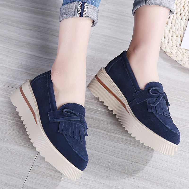 M12 Platåskor För Kvinnor Är Designade För Komfort Hela Dagen Och Hållbar Stil. Med En 2" Häl Och 1.5" Plattform Ger Dessa Slip-On Skor Lyft Utan Att Ge Avkall På Stabiliteten. Ovandelen I Premiummocka, Fodret I Äkta Läder Och Yttersulan I Gummi Skapar Den Perfekta Kombinationen Av Hållbarhet Och Lyx. Lyft Din Garderob Med Den Unika Fransdetaljen Hos Dessa Platåskor, Perfekta För Alla Säsonger.